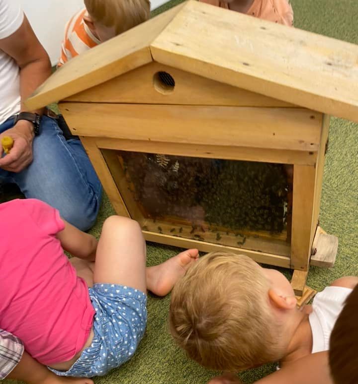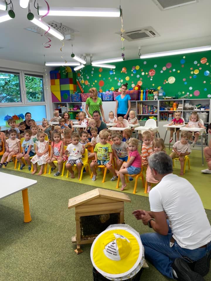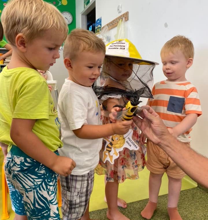 Dnia 22 lipca 2022r nasz żłobek odwiedził Pan Pszczelarz razem ze swoim ulem bardzo pracowitych pszczółek. Dzieci były zachwycone mogąc poprzymierzać kapelusz pszczelarza oraz sprawdzając jak działają różne przyrządy pomagające w pracy z pszczółkami. Dzieci miały także okazję spróbować pysznego miodku, który Pan Pszczelarz sam zebrał ze swojej pasieki. To bardzo ważne, abyśmy od najmłodszych lat uczyli dzieci o tym jak niezbędne są nam pszczoły do życia :)