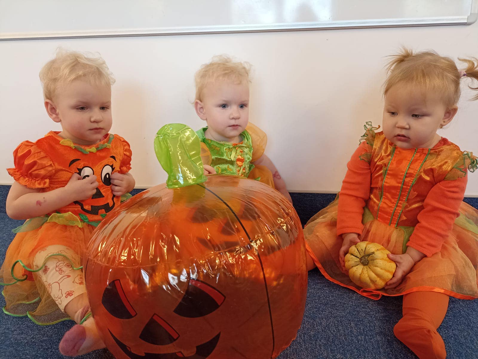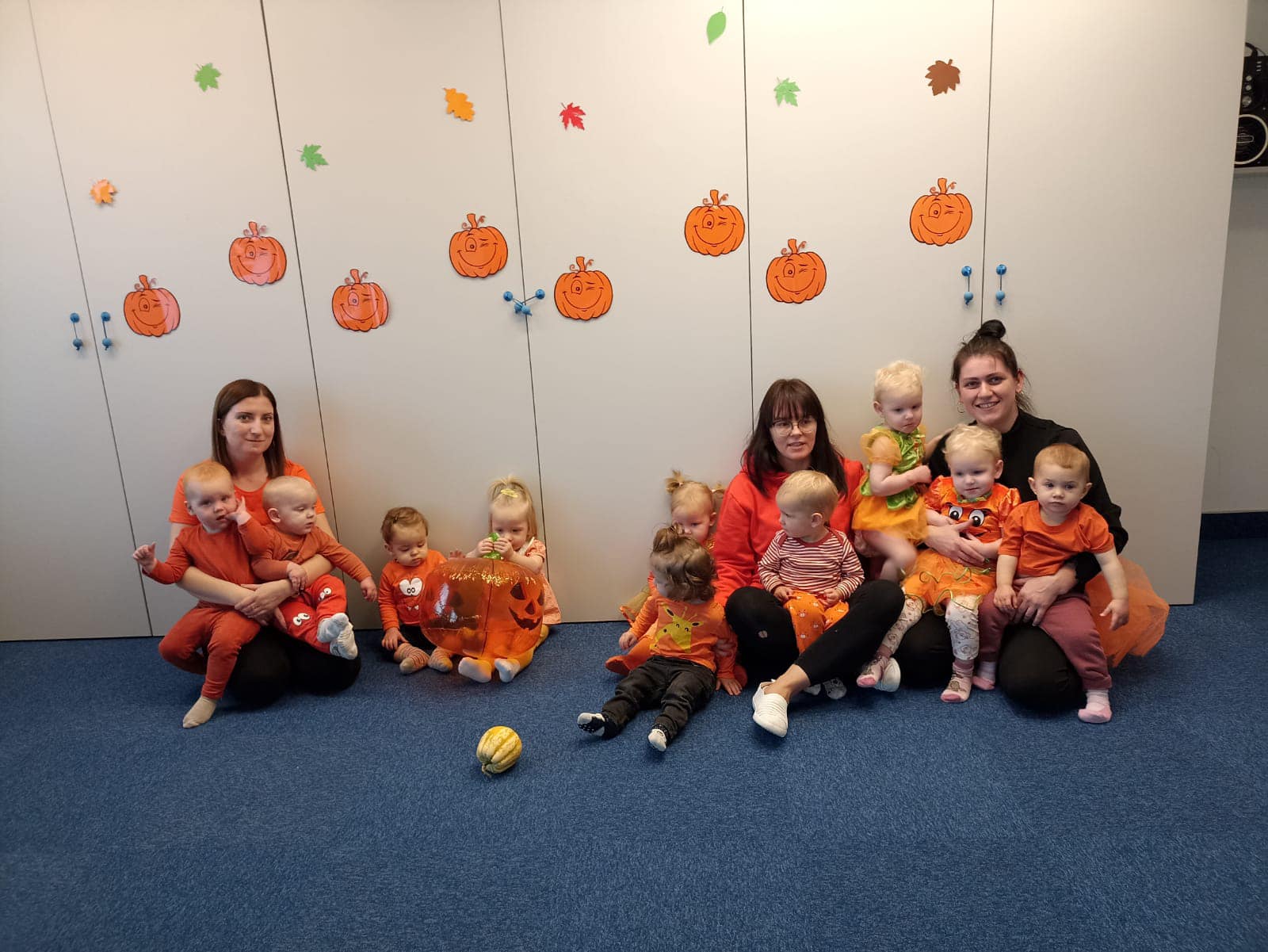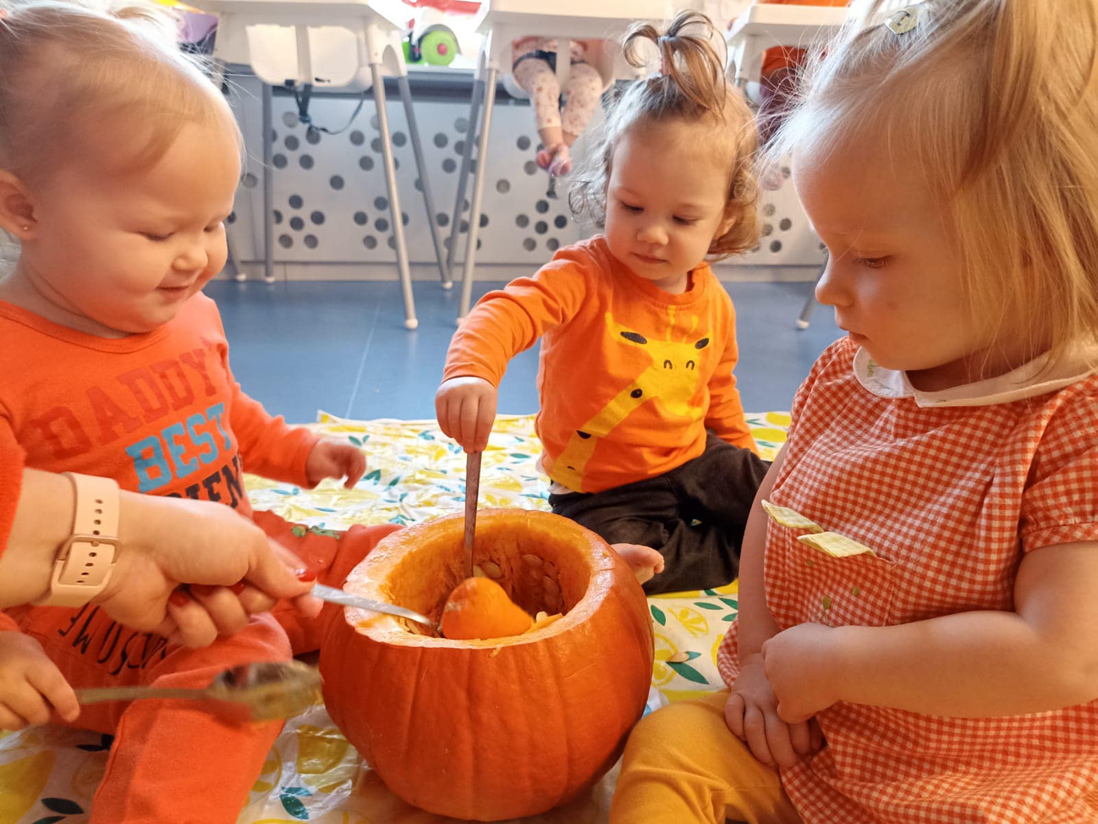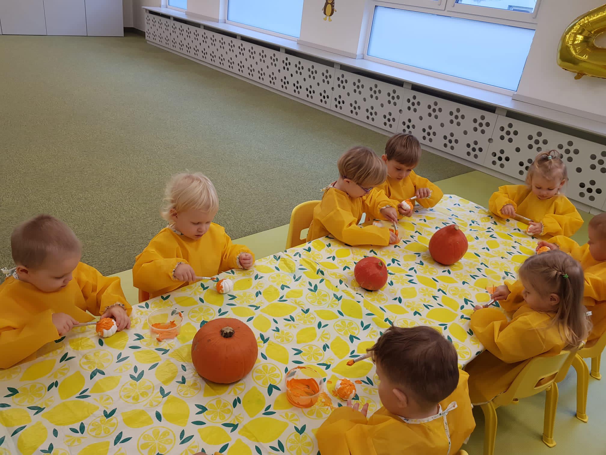 W październiku w naszym Żłobku świętowaliśmy Dzień Dyni. Każdy mógł przynieść swoją dynię oraz ubrać się na pomarańczowo. Wspólnie bawiliśmy się i poznawaliśmy różnorodne dynie, utrwalaliśmy kolor pomarańczowy. W grupie starszaków powstała wielka wspólna dynia, maluszki natomiast drążyły prawdziwą dynię. Wszystkie dzieci malowały mini dynie, które mogły zabrać ze sobą do domu.