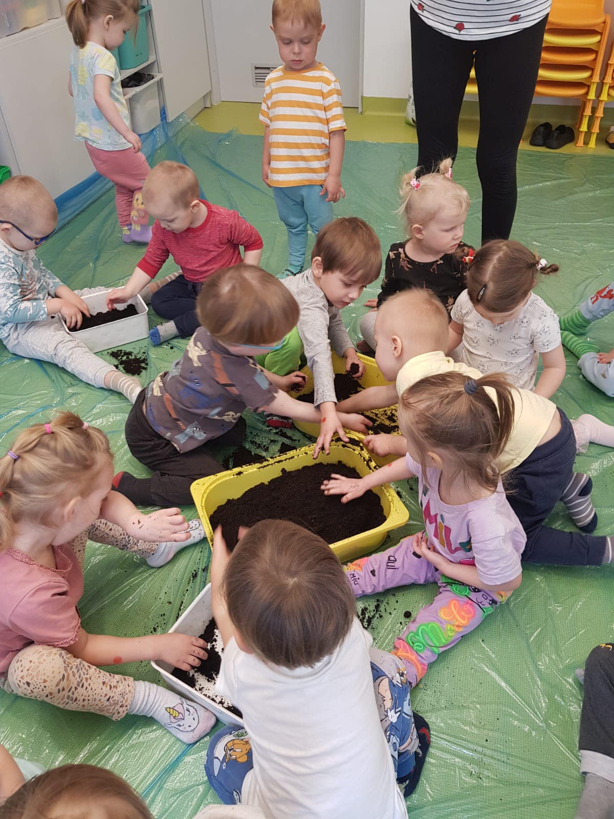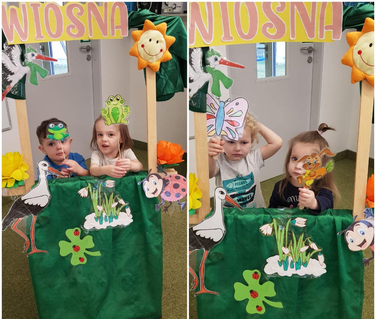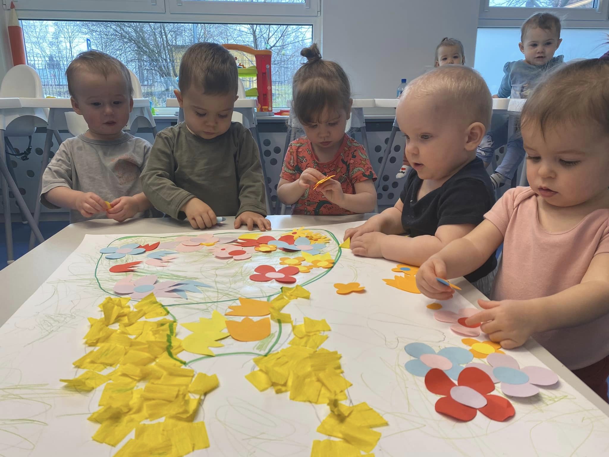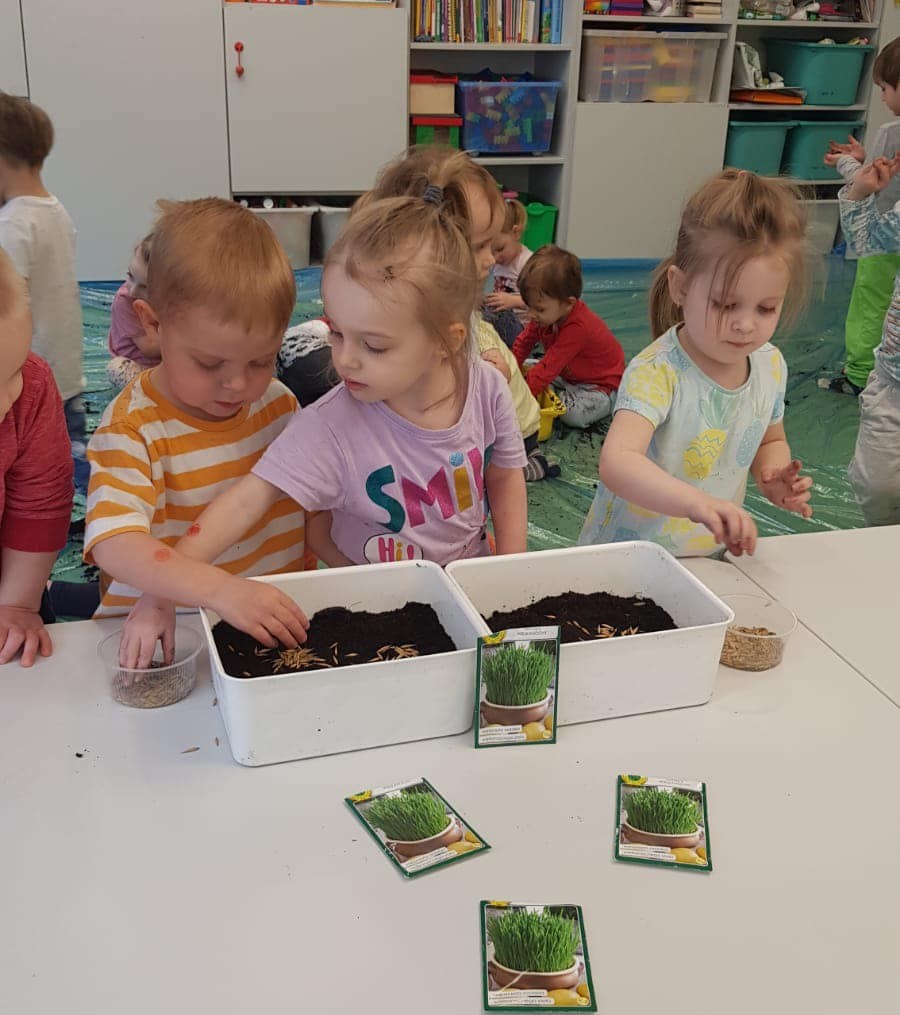 Wiosna w tym roku przychodzi do nas powoli, ale w żłobku świętujemy ją w pełni! W końcu mogliśmy kilka razy wyjść na spacer w poszukiwaniu jej oznak. Obie grupy z radością wykonały wiele prac plastycznych oraz ogrodniczych związanych z wiosną. Maluszki zasadziły fasolki, a starszaki zasiały owies. Pojawiło sie także kwitnące (popcornem) drzewo, piękne hiacynty oraz całe stado żabek. Odwiedziły nas także Marzanna oraz Pani Wiosna we własnej osobie. Wszyscy czekamy już na cieplejsze dni.