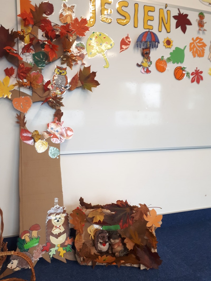,,Przyszedł sobie dawno śliczny,złoty wrzesień teraz nam październik dała pani jesień.Słonko takie śpiące,coraz poźniej wstaje.Ptaszki odlatują,hen w dalekie kraje.W cieniu pod drzewami cicho śpią kasztany,kazdy błyszczy pięknie niby malowany.